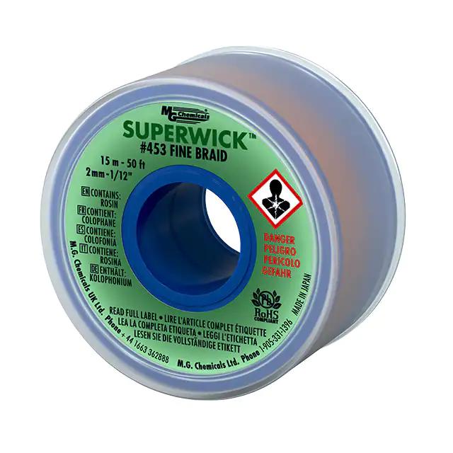This is manufactured by MG Chemicals. The manufacturer part number is 453. It is assigned with possible HTSUS value of 7413.00.1000. The product is rohs3 compliant. Furthermore, the product is 0.075" (1.91mm) wide. It comes in rosin, mildly activated (rma), lead free configuration. In addition, it is reach unaffected. It offers storage features at 72°f ~ 81°f (22°c ~ 27°c). It is shipped in bulk. Its typical moisture sensitivity level is not applicable. Its accurate length is 50' (15.24m). It has a long 2 weeks standard lead time. It has a classic green colour. The product superwick, 400, is a highly preferred choice for users. The product is designated with the ear99 code number