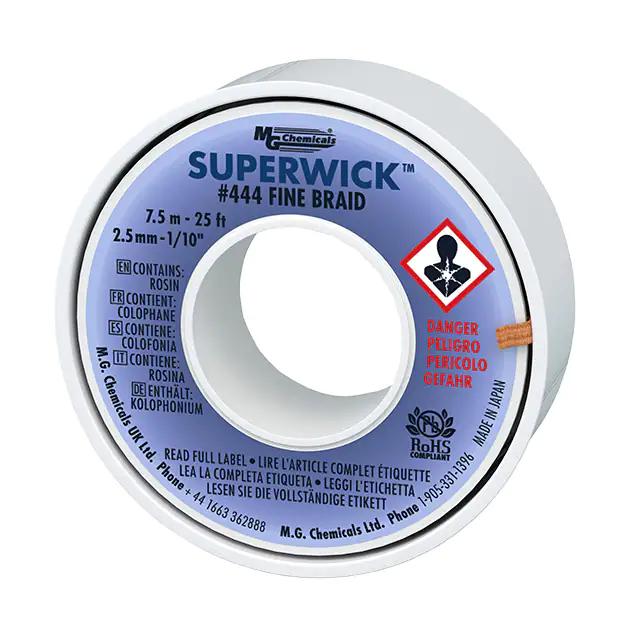 This is manufactured by MG Chemicals. The manufacturer part number is 444. It is assigned with possible HTSUS value of 7413.00.1000. The product is rohs3 compliant. Furthermore, the product is 0.100" (2.54mm) wide. It comes in rosin, mildly activated (rma), lead free configuration. In addition, it is reach unaffected. It offers storage features at 72°f ~ 81°f (22°c ~ 27°c). It is shipped in bulk. Its typical moisture sensitivity level is not applicable. Its accurate length is 25' (7.62m). It has a long 2 weeks standard lead time. It has a classic blue colour. The product superwick, 400, is a highly preferred choice for users. The product is designated with the ear99 code number