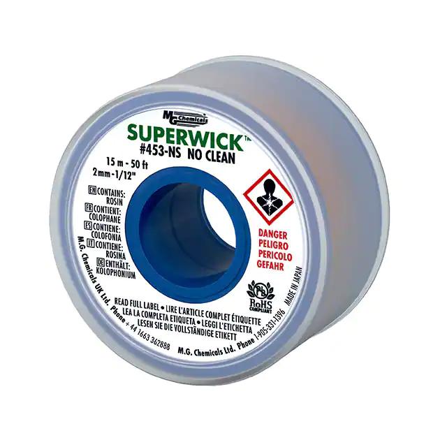 This is manufactured by MG Chemicals. The manufacturer part number is 453-NS. It is assigned with possible HTSUS value of 7413.00.1000. The product is rohs3 compliant. Furthermore, the product is 0.075" (1.91mm) wide. It comes in no clean, rosin, mildly activated (rma), lead free configuration. In addition, it is reach unaffected. It offers storage features at 72°f ~ 81°f (22°c ~ 27°c). It is shipped in bulk. Its typical moisture sensitivity level is not applicable. Its accurate length is 50' (15.24m). It has a long 2 weeks standard lead time. It has a classic green colour. The product superwick, 400-ns, is a highly preferred choice for users. The product is designated with the ear99 code number