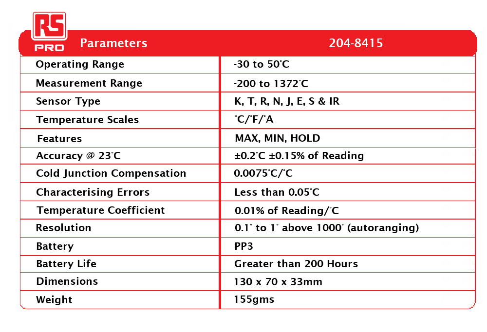 This is E J K N R S T Input Handheld Digital Thermometer for HVAC Industrial Use manufactured by RS PRO. The manufacturer part number is 204-8415. The typical product's weight is 155g. In addition, the height is 33mm. Furthermore, the product is 70mm wide. Its accurate length is 130mm. Features 0.1°→1000° resolution.