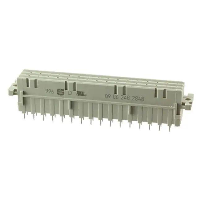 This is manufactured by HARTING. The manufacturer part number is 09062482848. Additionally, the product is designed with f Style. It is assigned with possible HTSUS value of 8536.69.4040. The product is rohs3 compliant. It is designed from highly reliable polybutylene terephthalate (pbt), glass filled insulating material. The product has -55°c ~ 125°c operating temperature range. The product carries possible position value of 48. In addition, it is reach unaffected. It comes in 3 of rows. It carries ul94 v-0 of material flammability rating. It is shipped in bulk. receptacle, female sockets Connector type offer robust functionality. Furthermore, the product is galvanized with excellent gold contact finishing. Its typical moisture sensitivity level is 1 (unlimited). The product features solder termination style. It has a long 8 weeks standard lead time. Additionally, the product's output is 6a The product is available in through hole configuration. The product din 41612, is a highly preferred choice for users. Moreover, the product is 0.200" (5.08mm) However, all is the Number of Positions Loaded. The product is designated with the ear99 code number