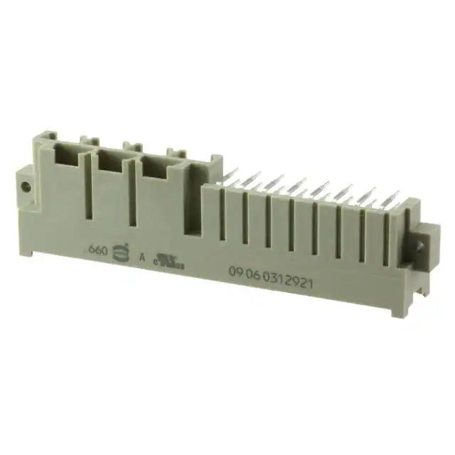 This is manufactured by HARTING. The manufacturer part number is 09060312921. Additionally, the product is designed with mh Style. It is assigned with possible HTSUS value of 8536.69.4040. The product is rohs3 compliant. It is designed from highly reliable polycyclohexylenedimethylene terephthalate (pct), glass filled insulating material. The product has -55°c ~ 125°c operating temperature range. The product carries possible position value of 31 (24 + 7 power). In addition, it is reach unaffected. It comes in 3 of rows. It carries ul94 v-0 of material flammability rating. It is shipped in bulk. header, male pins and blades Connector type offer robust functionality. Furthermore, the product is galvanized with excellent gold or gold-palladium contact finishing. Its typical moisture sensitivity level is 1 (unlimited). The product features solder termination style. It has a long 11 weeks standard lead time. The product is available in through hole, right angle configuration. The product din 41612, is a highly preferred choice for users. However, all is the Number of Positions Loaded. The product is designated with the ear99 code number