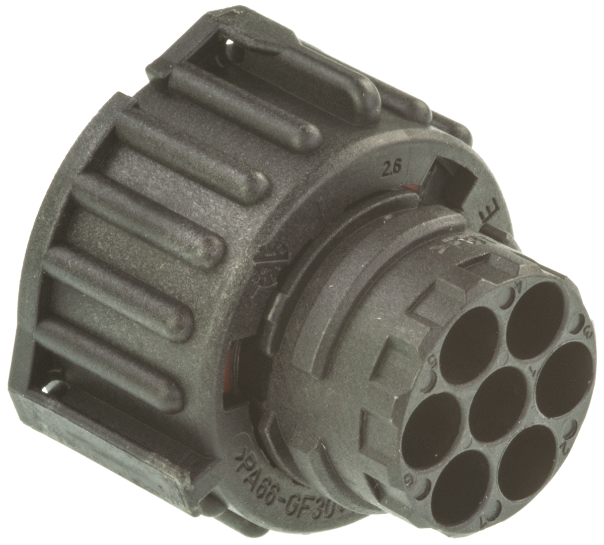 This is 7 Pole Din Socket Socket DIN 72585 IP69K Bayonet manufactured by TE Connectivity. The manufacturer part number is 967650-1. The product is available in cable mount configuration. In addition, female is the available "Gender" of the product. The product also features robust pbt housing material. The product contains 7 contacts.