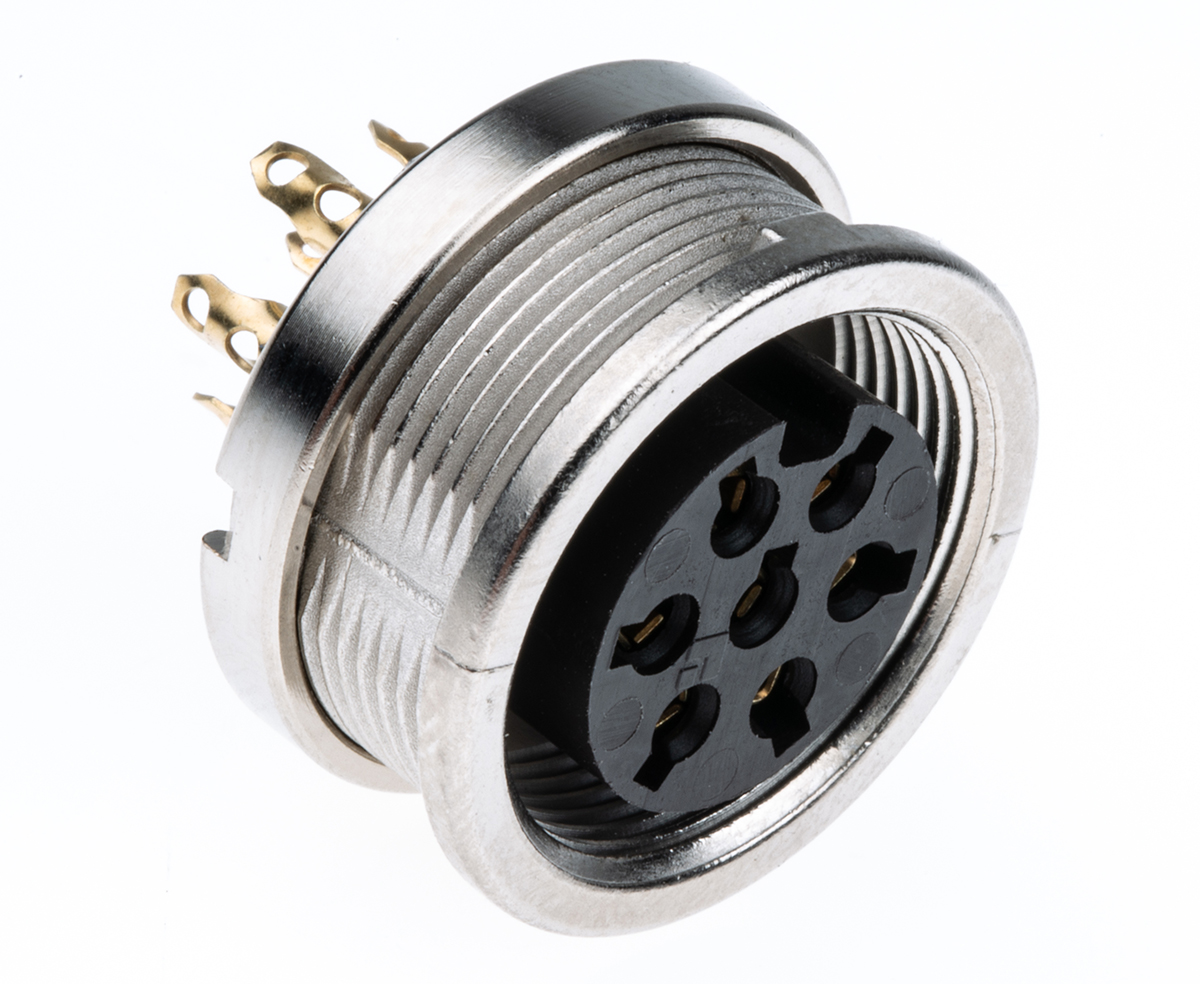 This is KFV Series 7 Pole Din Socket Socket DIN EN 60529 5A 250 V ac IP40 manufactured by Lumberg. The manufacturer part number is KFV 70. The product has a current rating of 5a. The product is available in panel mount configuration. In addition, female is the available "Gender" of the product. Moreover, the product has a nominal 250 v ac voltage rating. The product kfv, is a highly preferred choice for users. The product contains 7 contacts. It has a maximum operating temperature of +85°c. Whereas, the minimum operating temperature of the product is -40°c. The product is made from sturdy brass materials.