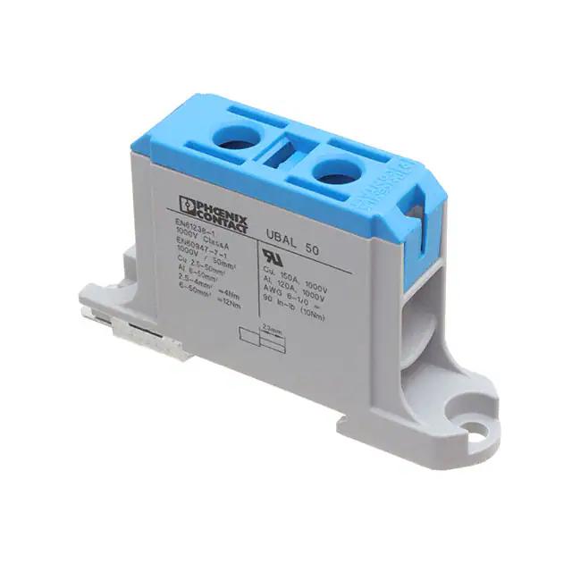 This is manufactured by Phoenix Contact. The manufacturer part number is 1086466. The product carries single levels. Moreover, the product has a nominal 1 kv voltage rating. The product ubal, is a highly preferred choice for users. It is assigned with possible HTSUS value of 8536.90.4000. The product is rohs3 compliant. Moreover, it has screw terminal style. It is designed from highly reliable polyamide (pa), nylon insulating material. It comes in feed through configuration. The product carries possible position value of 2. A 6-50mm² of wire gauge. In addition, it is reach unaffected. It carries ul94 v-0 of material flammability rating. It is shipped in bulk. It has a stripping length of 23mm. Its typical moisture sensitivity level is 1 (unlimited). An IEC current of 145 a. While 1/0-6 awg is its range or wire gauge. It has a long 7 weeks standard lead time. The built-in terminal is 19.2mm wide. The nominal voltage of the product is 1000v. It has a classic blue colour. The product clipline ubal, is a highly preferred choice for users. The product carries 1 levels. The product is designated with the ear99 code number