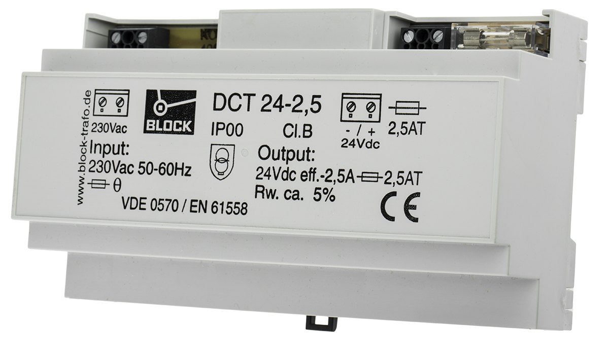 This is DCT Linear DIN Rail Panel Mount Power Supply 60W 24V dc/ 2.5A manufactured by Block. The manufacturer part number is DCT24/2.5. Additionally, the product is supplied with 1 outputs. Load Regulation - ±21%. The product is available in din rail mount configuration. The product dct, is a highly preferred choice for users. In addition, the height is 59mm. Furthermore, the product is 63mm wide. The product comes in 94mm depth. It comes in linear configuration.