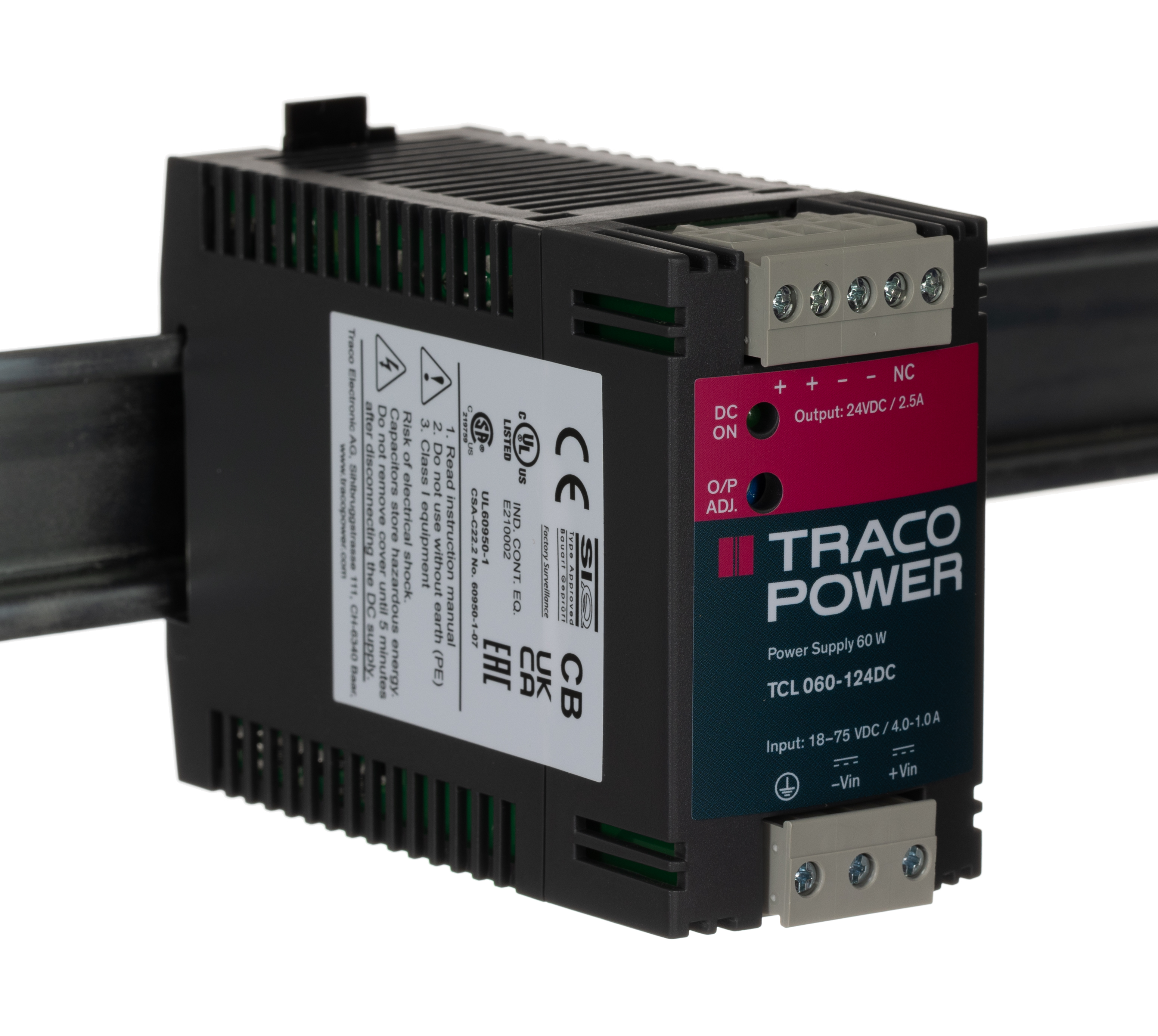 This is 24 → 60W Switch Mode DIN Rail Panel Mount Power Supply 24V dc/ 2.5A manufactured by TRACOPOWER. The manufacturer part number is TCL 060-124 DC. Additionally, the product is supplied with 1 outputs. Load Regulation - ±0.5%. The product is available in din rail mount configuration. The product tcl, is a highly preferred choice for users. In addition, the height is 75mm. Furthermore, the product is 45mm wide. The product comes in 100mm depth. It comes in switch mode configuration.