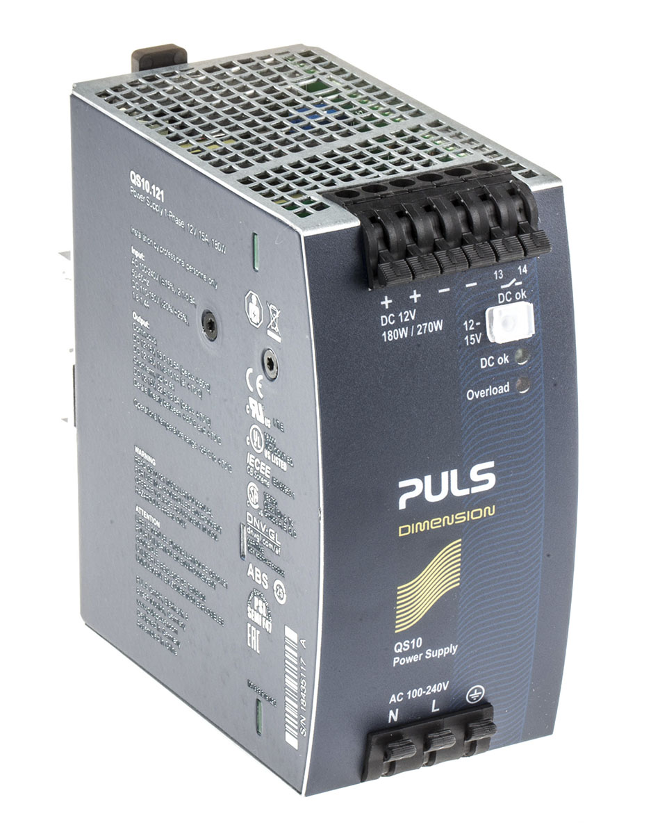 This is DIMENSION Q Switch Mode DIN Rail Panel Mount Power Supply 180W 85 → 276 V ac 88 → 187 V dc/ 15A manufactured by PULS. The manufacturer part number is QS10.121. Additionally, the product is supplied with 1 outputs. Load Regulation - 100mv. The product is available in din rail mount configuration. The product dimension q, is a highly preferred choice for users. In addition, the height is 124mm. Furthermore, the product is 60mm wide. The product comes in 117mm depth. It comes in switch mode configuration.