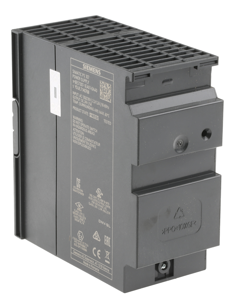 This is SIMATIC 120W Switch Mode DIN Rail Panel Mount Power Supply 24V dc/ 5A manufactured by Siemens. The manufacturer part number is 6ES7307-1EA01-0AA0. Additionally, the product is supplied with 1 outputs. Load Regulation - 0.5%. The product is available in din rail mount configuration. The product simatic s7-300, is a highly preferred choice for users. In addition, the height is 125mm. Furthermore, the product is 60mm wide. The product comes in 125mm depth. It comes in switch mode configuration.