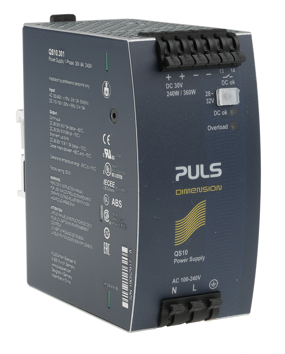 This is Dimension 240W Switch Mode DIN Rail Panel Mount Power Supply 30V dc/ 8A manufactured by PULS. The manufacturer part number is QS10.301. Additionally, the product is supplied with 1 outputs. Load Regulation - 100mv. The product is available in din rail mount configuration. The product dimension q, is a highly preferred choice for users. In addition, the height is 124mm. Furthermore, the product is 60mm wide. The product comes in 117mm depth. It comes in switch mode configuration.