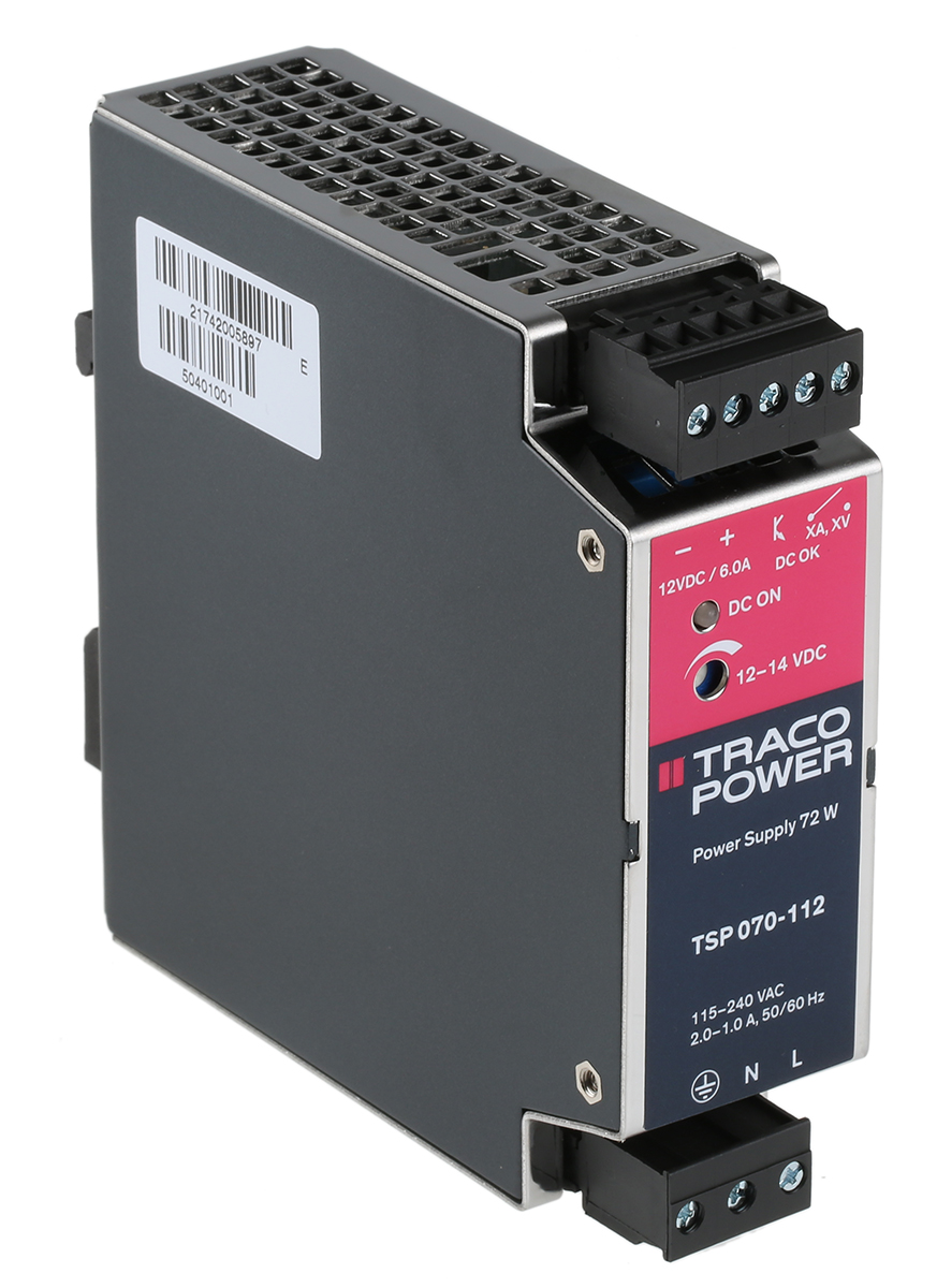 This is 72W Switch Mode DIN Rail Panel Mount Power Supply 12V dc/ 6.5A manufactured by TRACOPOWER. The manufacturer part number is TSP 070-112. Additionally, the product is supplied with 1 outputs. Load Regulation - ±0.5%. The product is available in din rail mount configuration. The product tsp, is a highly preferred choice for users. In addition, the height is 110mm. Furthermore, the product is 35mm wide. The product comes in 110mm depth. It comes in switch mode configuration.
