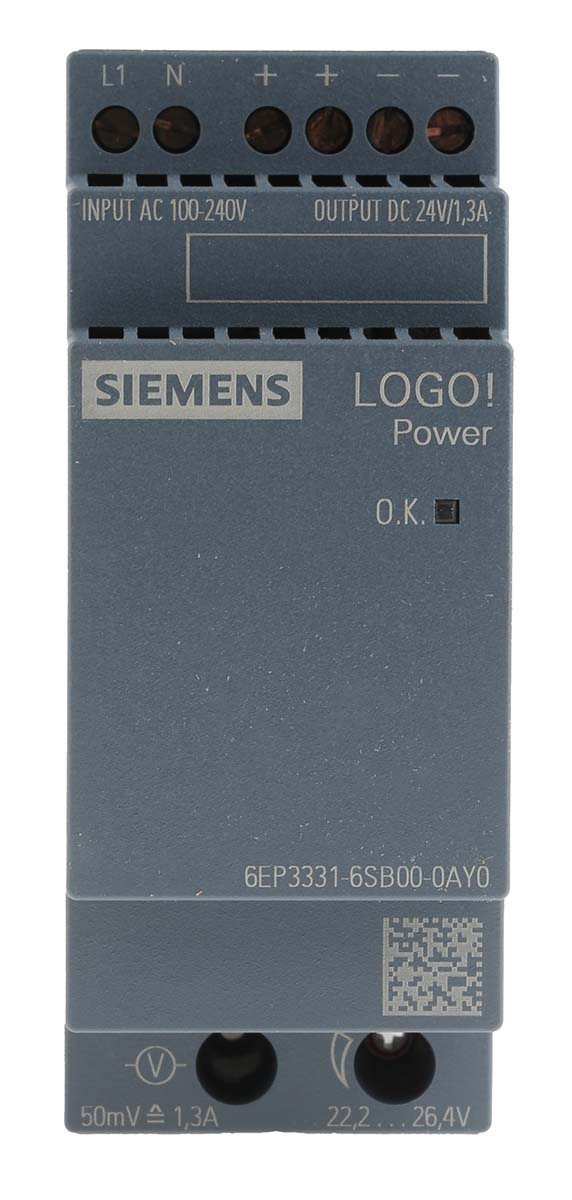 This is DIN Rail Power Supply 31.2W 24V dc/ 1.3A manufactured by Siemens. The manufacturer part number is 6EP3331-6SB00-0AY0. Furthermore, the product is 36mm wide. It comes in switch mode configuration. Load Regulation - 0.1%. It is a highly efficient product with an 86% of high efficiency. Additionally, the product is supplied with 1 outputs. The product comes in 53mm depth. The product is available in din rail mount configuration. The product logo!power, is a highly preferred choice for users. In addition, the height is 90mm.