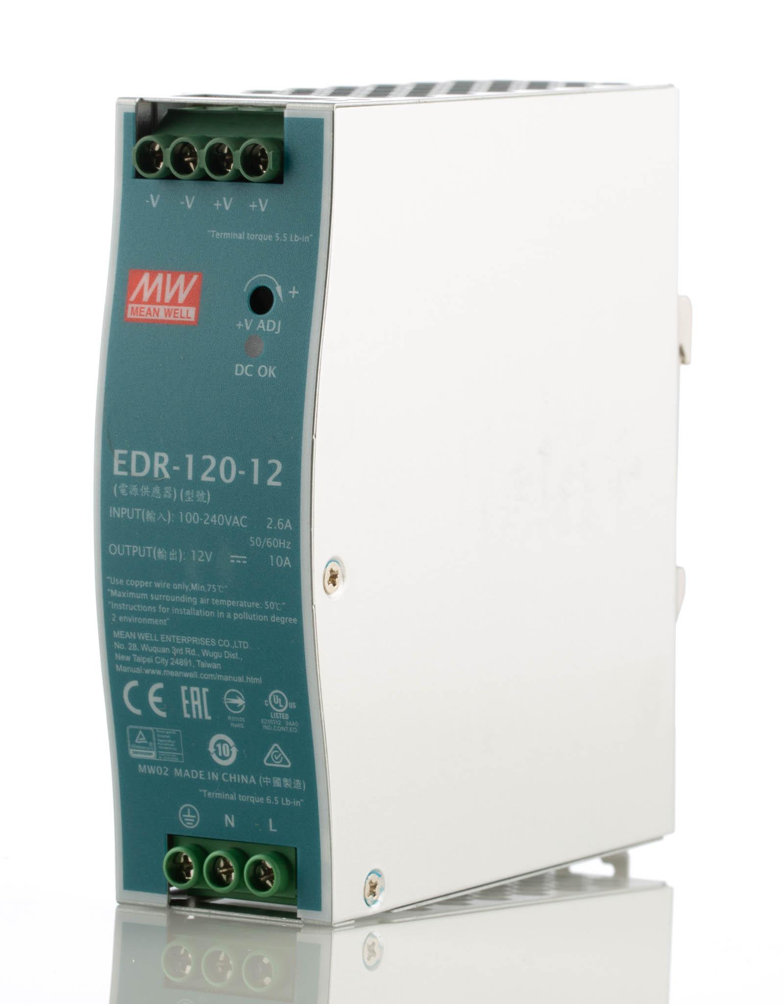 This is EDR DIN Rail Power Supply Switch Mode 120W 12V dc/ 10A manufactured by Mean Well. The manufacturer part number is EDR-120-12. Furthermore, the product is 40mm wide. It comes in switch mode configuration. Load Regulation - ±1%. Additionally, the product is supplied with 1 outputs. The product comes in 114mm depth. The product is available in din rail mount configuration. The product edr, is a highly preferred choice for users. In addition, the height is 125mm.