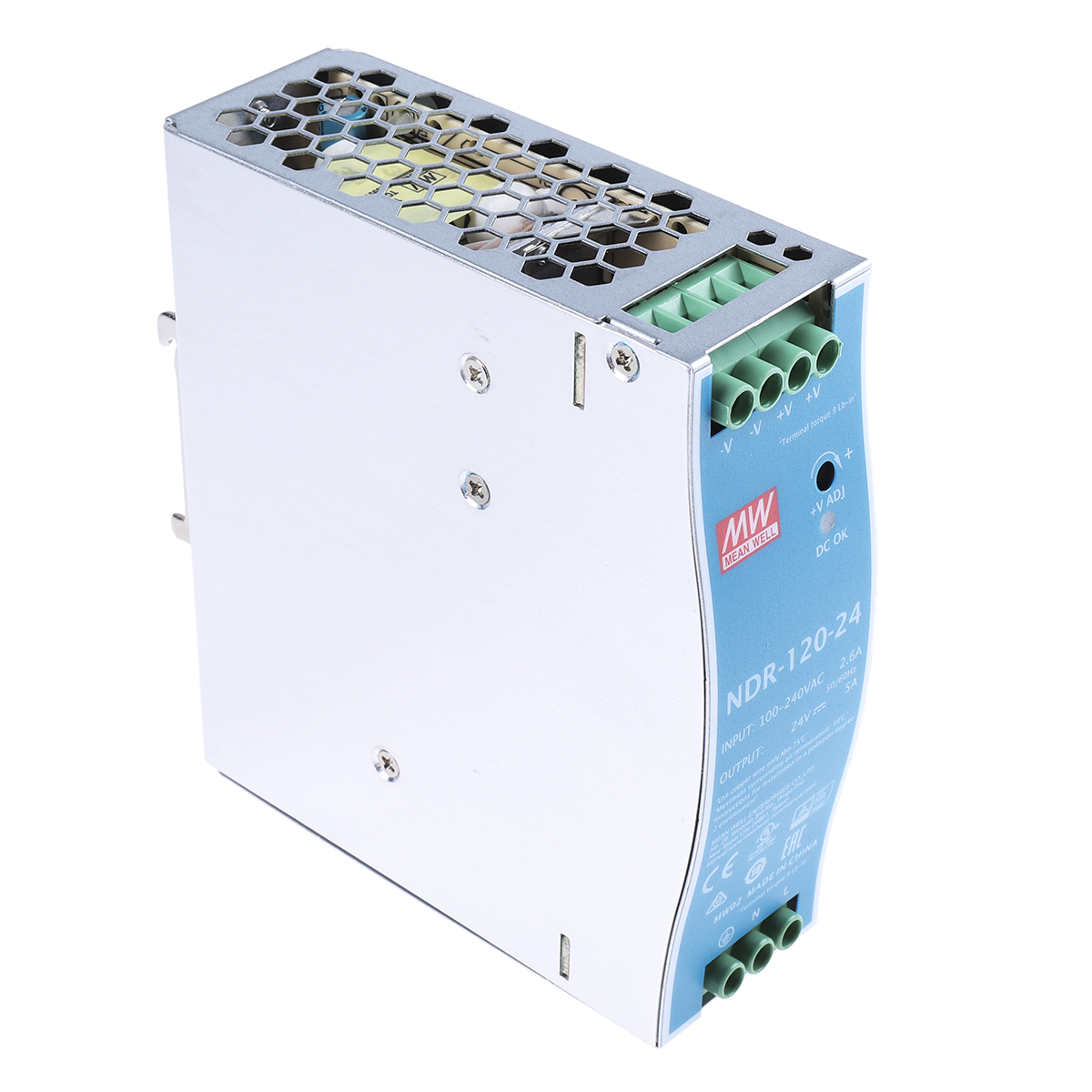 This is NDR-120 DIN Rail Power Supply 120W 24V dc/ 0 → 5A manufactured by Mean Well. The manufacturer part number is NDR-120-24. Furthermore, the product is 40mm wide. It comes in switch mode configuration. Load Regulation - ±1%. Additionally, the product is supplied with 1 outputs. The product comes in 114mm depth. The product is available in din rail mount configuration. The product ndr, is a highly preferred choice for users. In addition, the height is 125mm.