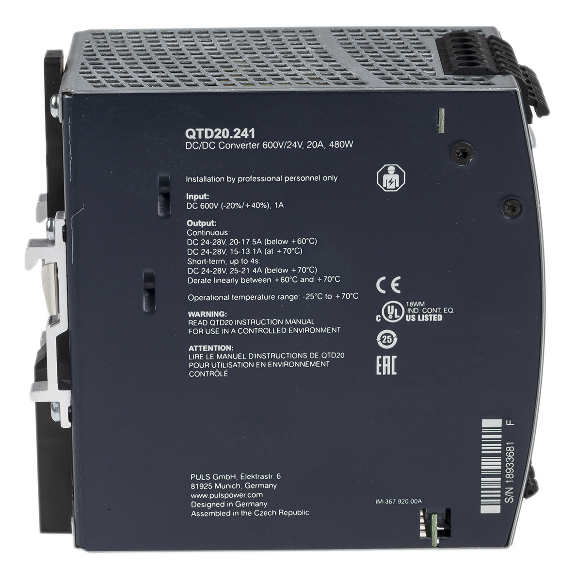 This is DIN Rail DC/DC Converter 24V 10A 240W manufactured by PULS. The manufacturer part number is QTD20.241. Furthermore, the product is 65mm wide. Load Regulation - 100mv. It is a highly efficient product with an 95% of high efficiency. Additionally, the product is supplied with 1 outputs. The product comes in 127mm depth. The product is available in din rail mount configuration. The product q, is a highly preferred choice for users. In addition, the height is 124mm.