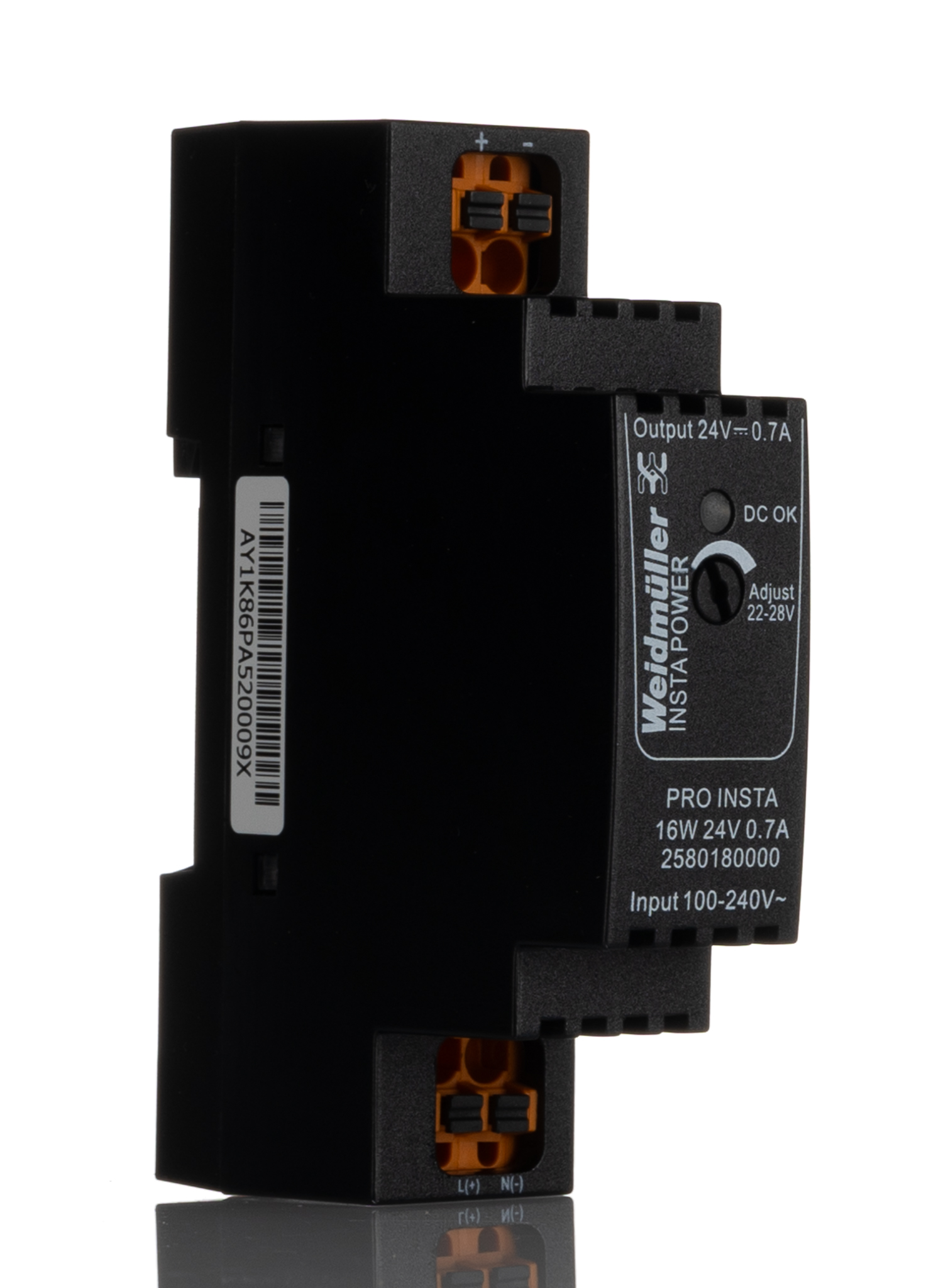 This is manufactured by Weidmuller. The manufacturer part number is 2580180000. The product pro insta, is a highly preferred choice for users. It has typical 10 weeks of manufacturer standard lead time. Additionally, the product is supplied with 1 outputs. It features enclosed ac dc converter 1 output 24v 700ma 85 ~ 264vac, 95 ~ 370vdc input. 4kv of isolation voltage. The splendid features of the product include adjustable output, ip20, universal input. The product is available in din rail configuration. The product is widely employed in ite (commercial). The product connect power insta (16w), is a highly preferred choice for users. It has a 24v output voltage. The product's diameters include 2.36" l x 0.89" w x 3.56" h (60.0mm x 22.5mm x 90.5mm). It is a highly efficient product with an 82.5% of high efficiency. The product features power and watts of 17w. The maximum product's output current is 700ma. The product complies with ccsaus, tuv. The possible product's input voltage is 85 ~ 264vac, 95 ~ 370vdc. The product has -25°c ~ 70°c (with derating) operating temperature range. It comes in enclosed configuration. The weidmuller's product offers user-desired applications.