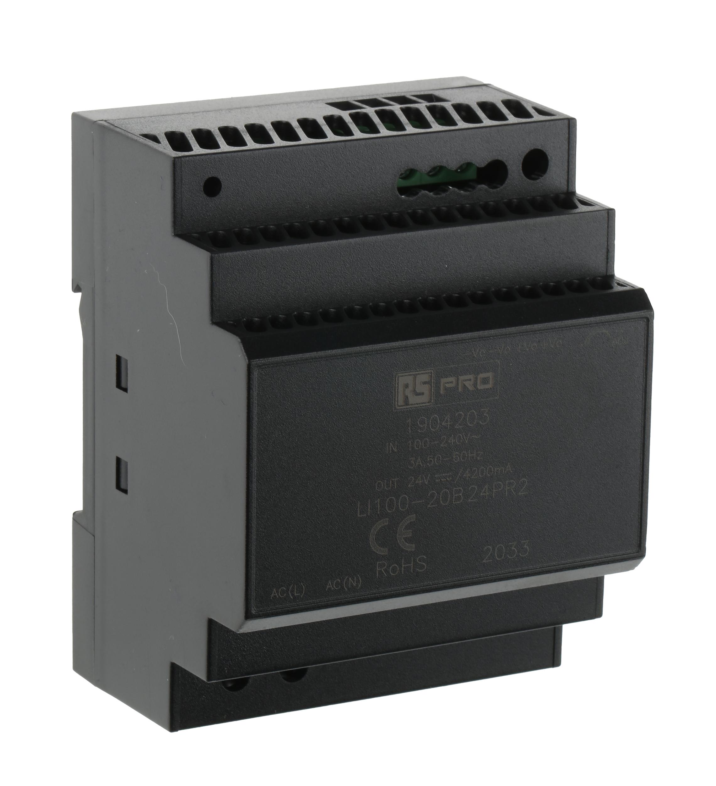 This is DIN Rail Power Supply 24V 4.2A 100.8W manufactured by RS PRO. The manufacturer part number is 190-4203. Additionally, the product is supplied with 1 outputs. Load Regulation - ±1.5 (typ.)%. The product is available in din rail mount configuration. In addition, the height is 58mm. It is a highly efficient product with an 90 (typ.)% of high efficiency. The product comes in 92.66mm depth. It comes in power supply configuration.