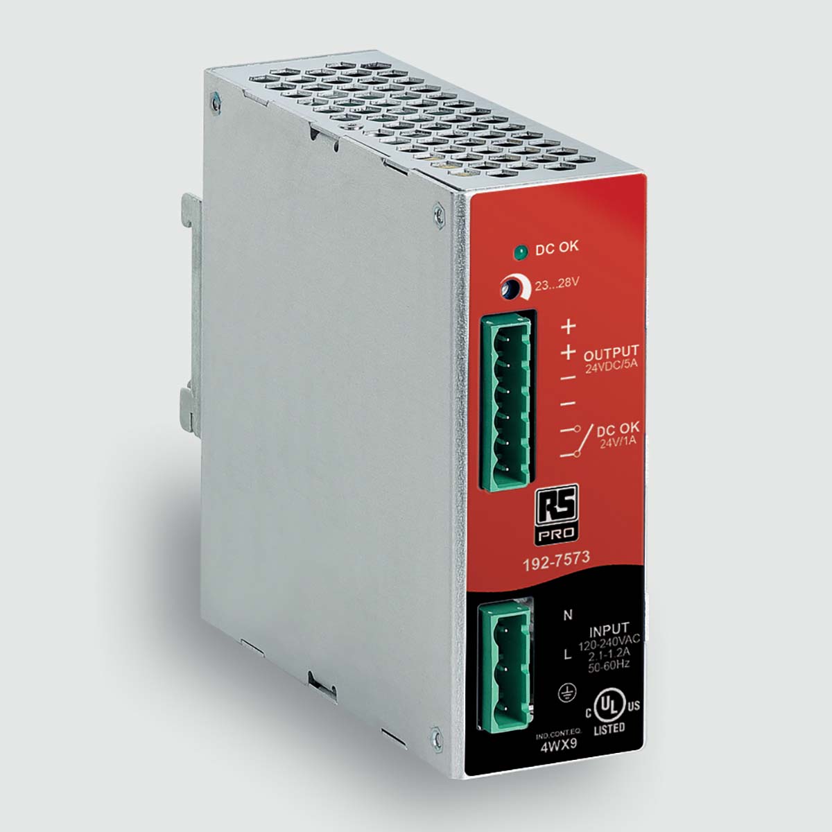 This is DIN Rail Power Supply 120V ac Input 24V Output 5A manufactured by RS PRO. The manufacturer part number is 192-7573. It is a highly efficient product with an >87% of high efficiency.