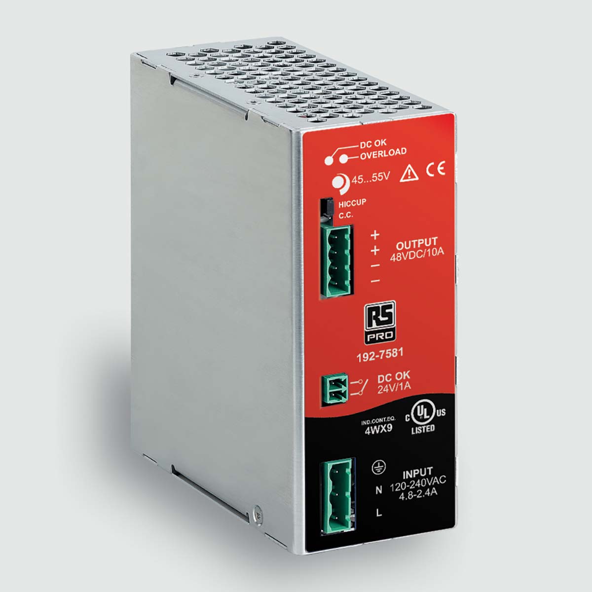 This is DIN Rail Power Supply 120V ac Input 48V Output 10A manufactured by RS PRO. The manufacturer part number is 192-7581. It is a highly efficient product with an >94% of high efficiency.