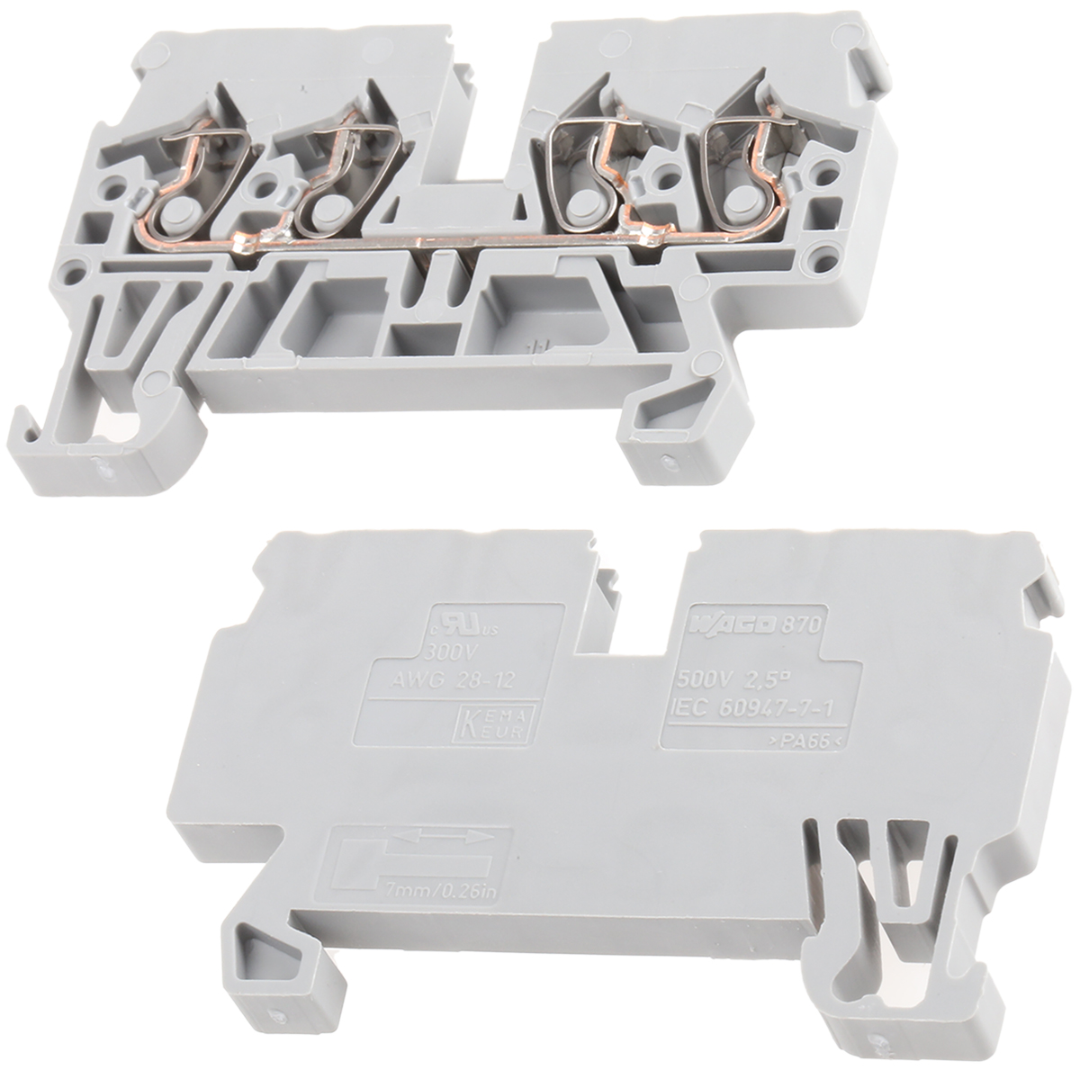 This is 500 V Feed Through Terminal Block Cage Clamp Termination manufactured by Wago. The manufacturer part number is 870-831. The product has a current rating of 24a. Moreover, the product has a nominal 500 v voltage rating. Moreover, the product is 5mm