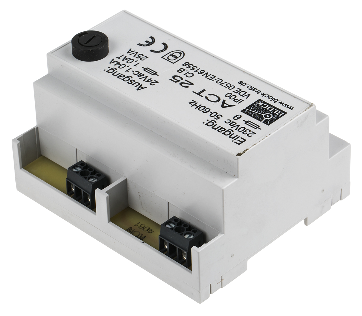 This is 25VA Isolating Transformer 230V ac Primary 1 x 24V ac Secondary manufactured by Block. The manufacturer part number is ACT25. Additionally, the product is supplied with 1 outputs. The given dimensions of the product include 106 x 94 x 63mm. The typical product's weight is 950g. Its accurate length is 106mm. Furthermore, the product is 94mm wide. The product comes in 63mm depth.