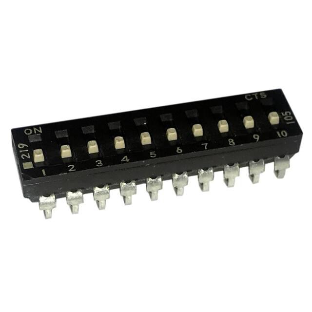 This is manufactured by CTS Electrocomponents. The manufacturer part number is 219-10MSJF. Washable - no. It is assigned with possible HTSUS value of 8536.50.9065. The product is rohs3 compliant. The product offers long-lasting services of 2,000 cycles. Moreover, it has j lead terminal style. The product has -55°c ~ 85°c operating temperature range. It is 0.210" (5.33mm) high above board. The product carries possible position value of 10. Features a raised actuator level. Moreover, the product has a nominal 20vdc voltage rating. In addition, it is reach unaffected. It is shipped in tube. Furthermore, the product is galvanized with excellent gold contact finishing. Its typical moisture sensitivity level is 1 (unlimited). Its accurate length is 1.058" (26.87mm). It has an integral spst circuit. It has a long 8 weeks standard lead time. Additionally, the product's output is 100ma The splendid features of the product include epoxy sealed terminals. The product is available in surface mount configuration. The product 219, is a highly preferred choice for users. The product carries slide (standard) actuator. Moreover, the product is 0.100" (2.54mm), full The product is made from sturdy beryllium copper materials. The product is designated with the ear99 code number