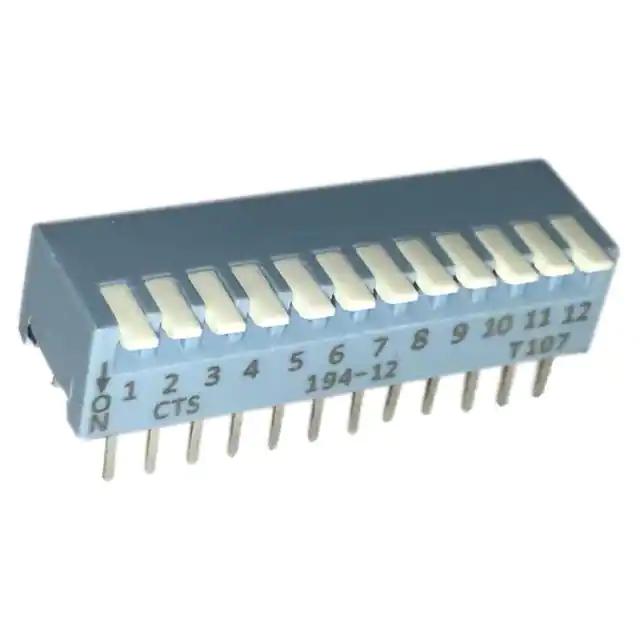 This is manufactured by CTS Electrocomponents. The manufacturer part number is 194-12MS. Washable - no. It is assigned with possible HTSUS value of 8536.50.9065. The product is rohs3 compliant. The product offers long-lasting services of 7,000 cycles. Moreover, it has pc pin terminal style. The product has -40°c ~ 85°c operating temperature range. It is 0.311" (7.90mm) high above board. The product carries possible position value of 12. Features a raised actuator level. Moreover, the product has a nominal 24vdc voltage rating. In addition, it is reach unaffected. It is shipped in tube. Furthermore, the product is galvanized with excellent gold contact finishing. Its typical moisture sensitivity level is 1 (unlimited). Its accurate length is 1.286" (32.66mm). It has an integral spst circuit. It has a long 8 weeks standard lead time. Additionally, the product's output is 50ma The splendid features of the product include epoxy sealed terminals. The product is available in through hole, right angle configuration. The product 194, is a highly preferred choice for users. The product's body is nicely designed from plastic materials. The product carries piano actuator. Moreover, the product is 0.100" (2.54mm), full The product is designated with the ear99 code number