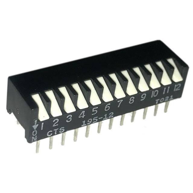 This is manufactured by CTS Electrocomponents. The manufacturer part number is 195-12MSN. Washable - no. It is assigned with possible HTSUS value of 8536.50.9065. The product is rohs3 compliant. The product offers long-lasting services of 2,000 cycles. Moreover, it has pc pin terminal style. The product has -40°c ~ 85°c operating temperature range. It is 0.311" (7.90mm) high above board. The product carries possible position value of 12. Features a raised actuator level. Moreover, the product has a nominal 24vdc voltage rating. In addition, it is reach unaffected. It is shipped in tube. Furthermore, the product is galvanized with excellent tin contact finishing. Its typical moisture sensitivity level is 1 (unlimited). Its accurate length is 1.286" (32.66mm). It has an integral spst circuit. It has a long 8 weeks standard lead time. Additionally, the product's output is 50ma The splendid features of the product include epoxy sealed terminals. The product is available in through hole, right angle configuration. The product 195, is a highly preferred choice for users. The product's body is nicely designed from plastic materials. The product carries piano actuator. Moreover, the product is 0.100" (2.54mm), full The product is designated with the ear99 code number