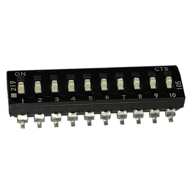 This is manufactured by CTS Electrocomponents. The manufacturer part number is 219-10MSR. Washable - no. It is assigned with possible HTSUS value of 8536.50.9065. The product is rohs3 compliant. The product offers long-lasting services of 2,000 cycles. Moreover, it has gull wing terminal style. The product has -55°c ~ 85°c operating temperature range. It is 0.170" (4.33mm) high above board. The product carries possible position value of 10. Features a raised actuator level. Moreover, the product has a nominal 20vdc voltage rating. In addition, it is reach unaffected. It is shipped in tape & reel (tr). Furthermore, the product is galvanized with excellent gold contact finishing. Its typical moisture sensitivity level is 1 (unlimited). Its accurate length is 1.058" (26.87mm). It has an integral spst circuit. It has a long 8 weeks standard lead time. Additionally, the product's output is 100ma The splendid features of the product include epoxy sealed terminals. The product is available in surface mount configuration. The product 219, is a highly preferred choice for users. The product carries slide (standard) actuator. Moreover, the product is 0.100" (2.54mm), full The product is made from sturdy beryllium copper materials. The product is designated with the ear99 code number