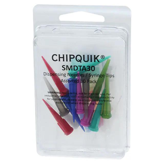 This is manufactured by Chip Quik Inc.. The manufacturer part number is SMDTA30. It is assigned with possible HTSUS value of 9018.32.0000. The product is rohs3 compliant. The built-in exquisite tip is a assorted tip. It comes in dispenser needle, tip kit configuration. In addition, it is reach unaffected. It is shipped in bulk. Its typical moisture sensitivity level is not applicable. It has a long 3 weeks standard lead time. It has a classic assorted colour. The product is designated with the ear99 code number