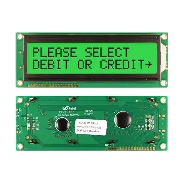 This is manufactured by Newhaven Display Intl. The manufacturer part number is NHD-0216SZ-FSPG-GBW. It is assigned with possible HTSUS value of 8531.20.0020. The product is rohs3 compliant. The product has -20°c ~ 70°c operating temperature range. In addition, it is reach unaffected. A bespoke product is parallel interface. It is shipped in box. Provides a 99.00mm l x 24.00mm w viewing area. Its typical moisture sensitivity level is not applicable. The product has a classic green background colour. It features a remarkable stn - super-twisted nematic display. Consists of 32 characters. It has optimum voltage supply of 4.7v ~ 5.5v. Moreover, it corresponds to nhd-0216, a base product number of the product. Typically has a transflective display mode. Has a dot size of 1.00mm w x 1.15mm h. Backlight Options - led - green. The product is designated with the ear99 code number