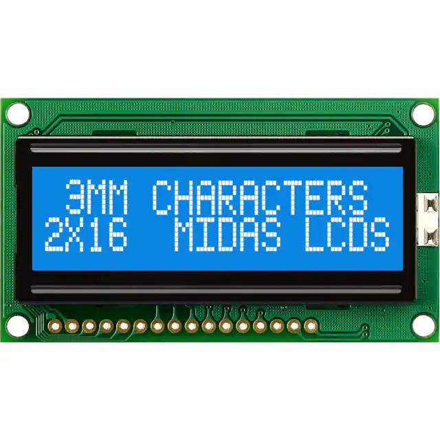 This is manufactured by Midas Displays. The manufacturer part number is MC21603A6W-BNMLW-V2. It is assigned with possible HTSUS value of 8531.20.9500. The product is rohs3 compliant. The product has -20°c ~ 70°c operating temperature range. In addition, it is reach unaffected. A bespoke product is parallel interface. It is shipped in tray. Provides a 36.00mm l x 10.00mm w viewing area. Its typical moisture sensitivity level is not applicable. The product has a classic blue background colour. It features a remarkable stn - super-twisted nematic display. The product mc21603a, is a highly preferred choice for users. Consists of 32 characters. It has optimum voltage supply of 5v. Typically has a transmissive display mode. Has a dot size of 0.33mm w x 0.35mm h. Backlight Options - led - white. The product is designated with the ear99 code number