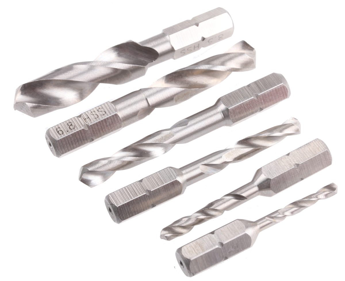 This is HSS M3 to M10 6 piece 1/4 in Hexagon Drive Drill Set manufactured by RS Pro. The manufacturer part number is 828-123. The product is made from highly stable and reliable hss.