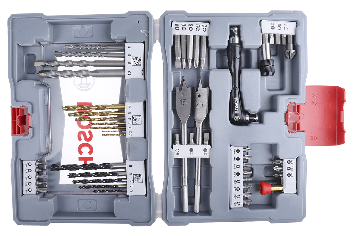 Concrete Drill Bits:5, 6, 8, 10 mm, HSS-TiN Metal Drill Bits:2 x 2, 2 x 3, 4, 5, 6 mm, Wood Drill Bits:3, 4, 5, 6, 8 mm, Screwdriver Bits 25 mm:PH0 (1, 2, 3), PZ0 (0,2 x 1, 2 x 2, 3, S4, 5, 6, T10, 15, 20, 25, 30, H4, 5, 6), Screwdriver Bits 50 mm:PH2, PZ