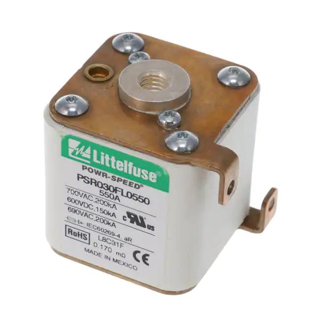This is manufactured by Littelfuse Inc.. The manufacturer part number is PSR030FL0550Z. It is assigned with possible HTSUS value of 8536.10.0040. The product is rohs3 compliant. Whereas, the breaking capacity of the product at rated voltage is 200ka ac, 150ka dc. 600 v of DC voltage rating. The product has -55°c ~ 125°c operating temperature range. It is approved by ccc, ce, curus, ul. The product exhibits 700 v of AC voltage rating. In addition, it is reach unaffected. The product is widely employed in semiconductors. It has a 44323 melting I²t. It responds within fast blow. It is shipped in bulk. The product's diameters include 1.969" l x 1.693" w x 1.929" h (50.00mm x 43.00mm x 49.00mm). It has a long 9 weeks standard lead time. Additionally, the product's output is 550a Its typical moisture sensitivity level is not applicable. The product is available in bolt mount configuration. The product powr-speed® psr, is a highly preferred choice for users. It integrates a square fuse type. The product is designated with the ear99 code number