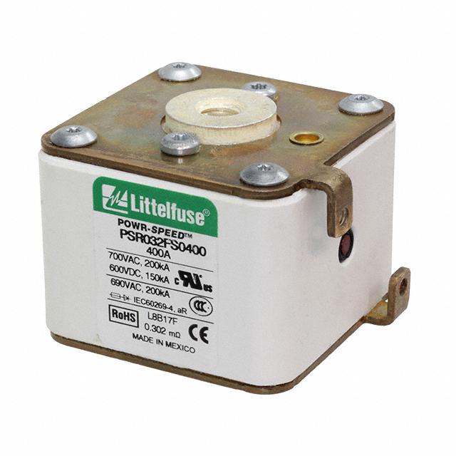 This is manufactured by Littelfuse Inc.. The manufacturer part number is PSR032FS0400Z. It is assigned with possible HTSUS value of 8536.10.0040. The product is rohs3 compliant. Whereas, the breaking capacity of the product at rated voltage is 200ka ac, 150ka dc. 600 v of DC voltage rating. The product has -55°c ~ 125°c operating temperature range. It is approved by ccc, ce, curus, ul. The product exhibits 700 v of AC voltage rating. In addition, it is reach unaffected. The product is widely employed in semiconductors. It has a 11104 melting I²t. It responds within fast blow. It is shipped in bulk. The product's diameters include 2.008" l x 2.362" w x 2.598" h (51.00mm x 60.00mm x 66.00mm). It has a long 9 weeks standard lead time. Additionally, the product's output is 400a Its typical moisture sensitivity level is not applicable. The product is available in bolt mount configuration. The product powr-speed® psr, is a highly preferred choice for users. It integrates a square fuse type. The product is designated with the ear99 code number