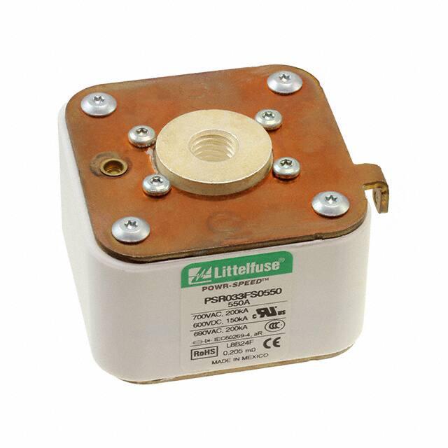This is manufactured by Littelfuse Inc.. The manufacturer part number is PSR033FS0550Z. It is assigned with possible HTSUS value of 8536.10.0040. The product is rohs3 compliant. Whereas, the breaking capacity of the product at rated voltage is 200ka ac, 150ka dc. 600 v of DC voltage rating. The product has -55°c ~ 125°c operating temperature range. It is approved by ccc, ce, curus, ul. The product exhibits 700 v of AC voltage rating. In addition, it is reach unaffected. The product is widely employed in semiconductors. It has a 23314 melting I²t. It responds within fast blow. It is shipped in bulk. The product's diameters include 2.008" l x 2.894" w x 3.130" h (51.00mm x 73.50mm x 79.50mm). It has a long 9 weeks standard lead time. Additionally, the product's output is 550a Its typical moisture sensitivity level is not applicable. The product is available in bolt mount configuration. The product powr-speed® psr, is a highly preferred choice for users. It integrates a square fuse type. The product is designated with the ear99 code number