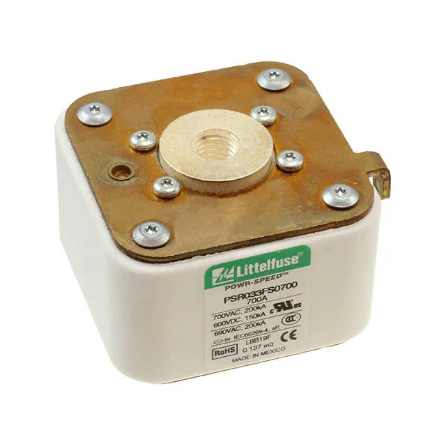 This is manufactured by Littelfuse Inc.. The manufacturer part number is PSR033FS0700Z. It is assigned with possible HTSUS value of 8536.10.0040. The product is rohs3 compliant. Whereas, the breaking capacity of the product at rated voltage is 200ka ac, 150ka dc. 600 v of DC voltage rating. The product has -55°c ~ 125°c operating temperature range. It is approved by ccc, ce, curus, ul. The product exhibits 700 v of AC voltage rating. In addition, it is reach unaffected. The product is widely employed in semiconductors. It has a 56763 melting I²t. It responds within fast blow. It is shipped in bulk. The product's diameters include 2.008" l x 2.894" w x 3.130" h (51.00mm x 73.50mm x 79.50mm). It has a long 9 weeks standard lead time. Additionally, the product's output is 700a Its typical moisture sensitivity level is not applicable. The product is available in bolt mount configuration. The product powr-speed® psr, is a highly preferred choice for users. It integrates a square fuse type. The product is designated with the ear99 code number