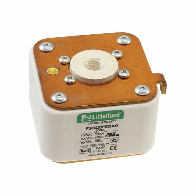 This is manufactured by Littelfuse Inc.. The manufacturer part number is PSR033FS0800Z. It is assigned with possible HTSUS value of 8536.10.0040. The product is rohs3 compliant. Whereas, the breaking capacity of the product at rated voltage is 200ka ac, 150ka dc. 600 v of DC voltage rating. The product has -55°c ~ 125°c operating temperature range. It is approved by ccc, ce, curus, ul. The product exhibits 700 v of AC voltage rating. In addition, it is reach unaffected. The product is widely employed in semiconductors. It has a 84691 melting I²t. It responds within fast blow. It is shipped in bulk. The product's diameters include 2.008" l x 2.894" w x 3.130" h (51.00mm x 73.50mm x 79.50mm). Additionally, the product's output is 800a Its typical moisture sensitivity level is not applicable. The product is available in bolt mount configuration. The product powr-speed® psr, is a highly preferred choice for users. It integrates a square fuse type. The product is designated with the ear99 code number