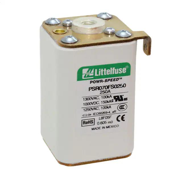 This is manufactured by Littelfuse Inc.. The manufacturer part number is PSR070FS0250Z. It is assigned with possible HTSUS value of 8535.10.0040. The product is rohs3 compliant. Whereas, the breaking capacity of the product at rated voltage is 100ka ac, 150ka dc. 1 kv of DC voltage rating. The product has -55°c ~ 125°c operating temperature range. It is approved by ccc, ce, curus, ul. The product exhibits 1.3 kv of AC voltage rating. In addition, it is reach unaffected. The product is widely employed in semiconductors. It has a 8629 melting I²t. It responds within fast blow. It is shipped in bulk. The product's diameters include 2.913" l x 1.693" w x 1.929" h (74.00mm x 43.00mm x 49.00mm). It has a long 9 weeks standard lead time. Additionally, the product's output is 250a Its typical moisture sensitivity level is not applicable. The product is available in bolt mount configuration. The product powr-speed® psr, is a highly preferred choice for users. It integrates a square fuse type. The product is designated with the ear99 code number