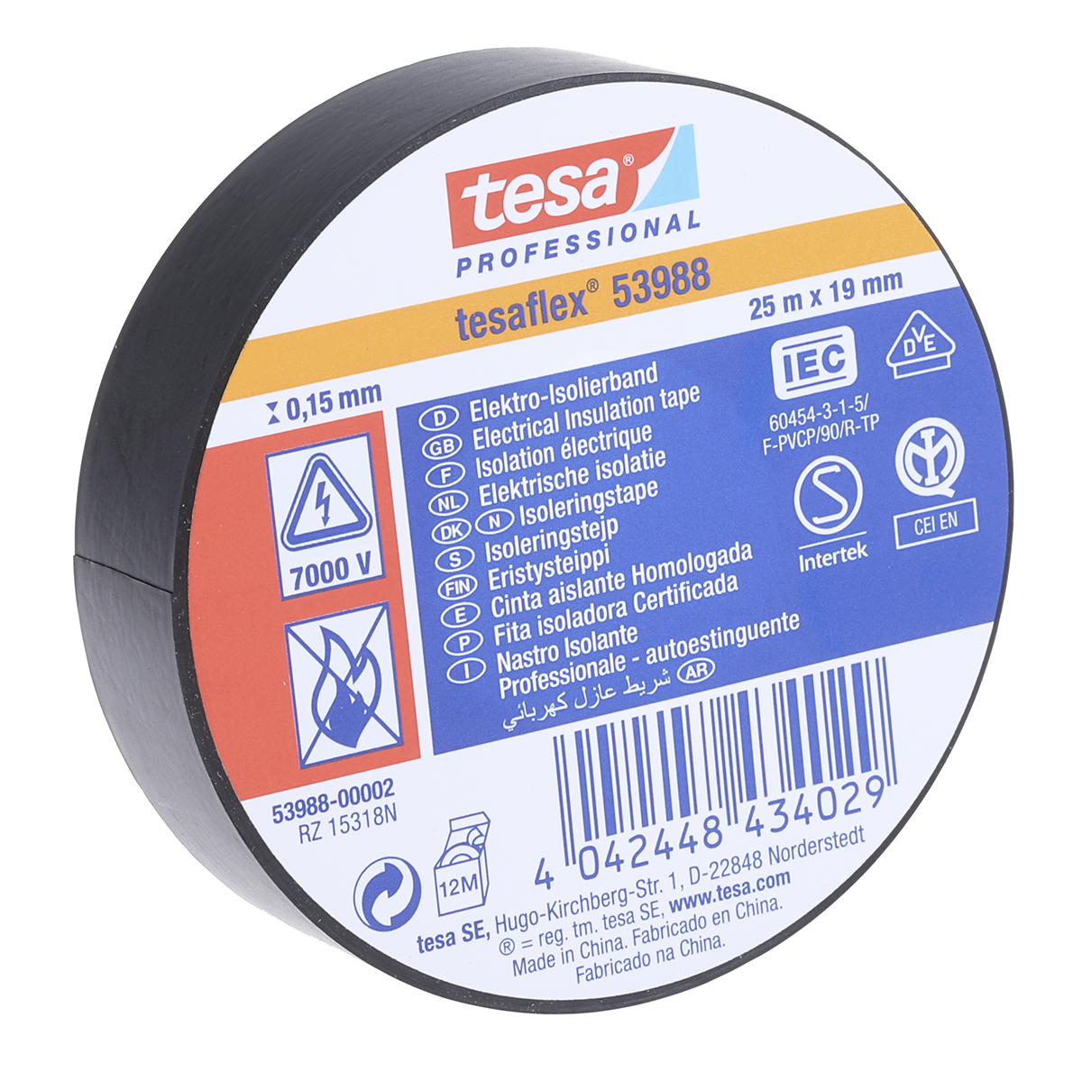This is Black Electrical Tape 19mm x 25m manufactured by Tesa. The manufacturer part number is 53988. It is 0.15mm thick. Furthermore, the product is 19mm wide. Its accurate length is 25m. It has a maximum operating temperature of +90°c.
