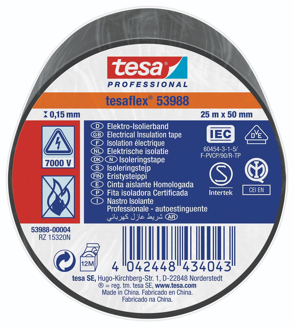 This is Black PVC Electrical Insulation Tape 50mm x 25m manufactured by Tesa. The manufacturer part number is 53988-00004-00. Furthermore, the product is 50mm wide. Its accurate length is 25m. It is 0.15mm thick.