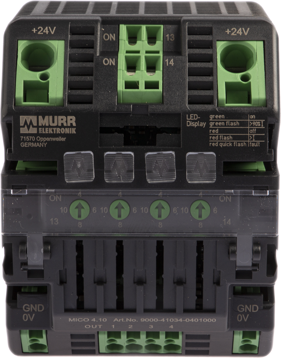 This is MICO Intelligent 24 V dc Circuit Protection 4 Channels 4 A 6 A 8 A 10 A manufactured by Murrelektronik Limited. The manufacturer part number is 9000-41034-0401000.