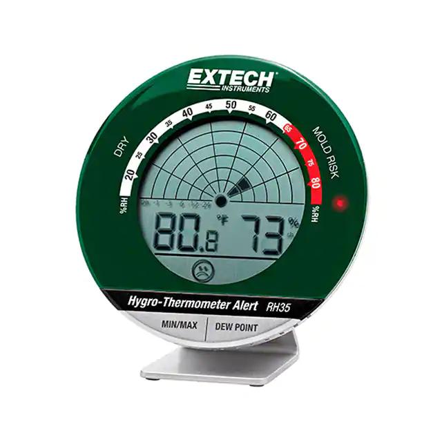 This is manufactured by FLIR Extech. The manufacturer part number is RH35. It is assigned with possible HTSUS value of 0000.00.0000. It is shipped in box. Its typical moisture sensitivity level is not applicable. The product is also supplied with battery, stand. It has a long 6 weeks standard lead time. It comes in hygro thermometer (thermo hygrometer) configuration. It is ideal for measuring humidity, temperature.