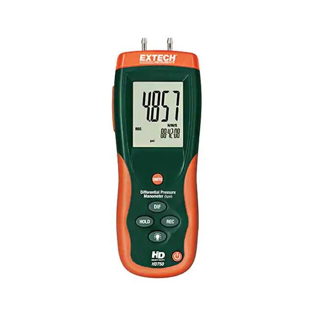 This is manufactured by FLIR Extech. The manufacturer part number is HD750. It is assigned with possible HTSUS value of 0000.00.0000. It is shipped in box. Its typical moisture sensitivity level is not applicable. The product is also supplied with adapter, battery, cable, case, hose, software. It has a long 11 weeks standard lead time. It comes in manometer configuration. It is ideal for measuring pressure (air).