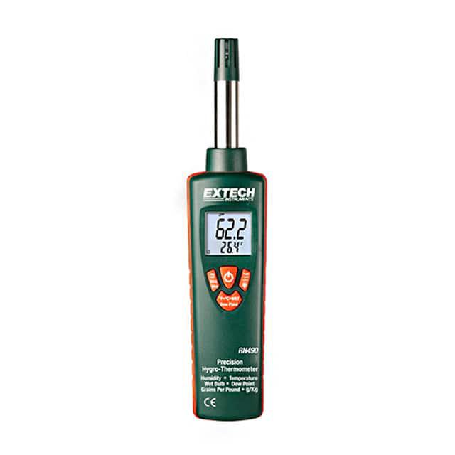 This is manufactured by FLIR Extech. The manufacturer part number is RH490. It is assigned with possible HTSUS value of 0000.00.0000. It is shipped in box. Its typical moisture sensitivity level is not applicable. It has a long 6 weeks standard lead time. It comes in hygro thermometer (thermo hygrometer) configuration. It is ideal for measuring humidity, temperature.
