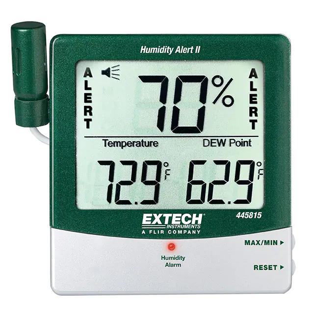 This is manufactured by FLIR Extech. The manufacturer part number is 445815. It is assigned with possible HTSUS value of 9025.80.5000. It is shipped in box. Its typical moisture sensitivity level is not applicable. The product is also supplied with battery, manual, sensor. It has a long 6 weeks standard lead time. It comes in hygro thermometer (thermo hygrometer) configuration. It is ideal for measuring humidity, temperature. The product is designated with the ear99 code number