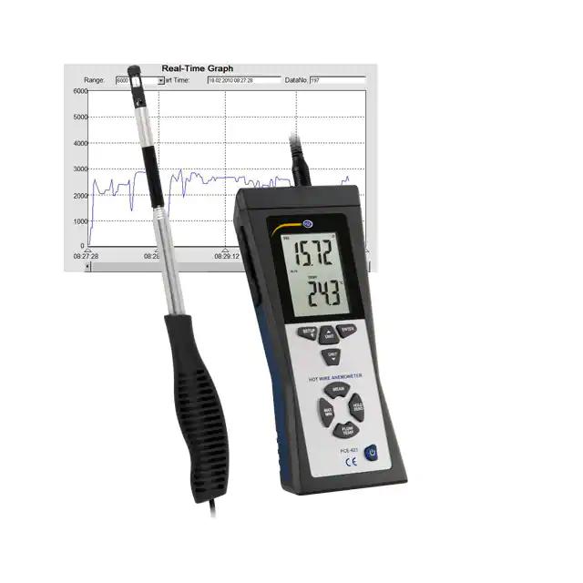 This is manufactured by PCE Instruments. The manufacturer part number is PCE-423. It is assigned with possible HTSUS value of 9026.10.2040. It is shipped in box. The product is not applicable. In addition, it is vendor undefined. Its typical moisture sensitivity level is not applicable. The product is also supplied with adapter, battery, cable, case, manual, software. It comes in anemometer configuration. It is ideal for measuring air flow, air velocity, temperature. The product is designated with the ear99 code number