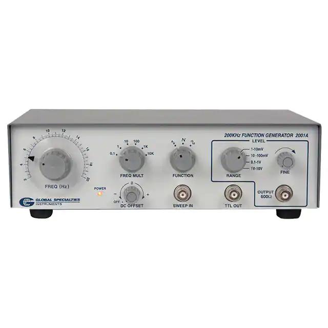 This is manufactured by Global Specialties. The manufacturer part number is 2001A. It performs basic function of sweep. It features a remarkable analog display. The typical product's weight is 4.5 lbs (2 kg). It is assigned with possible HTSUS value of 8543.20.0000. It is shipped in bulk. The product is rohs compliant. It maximum frequency is 200 khz. Its typical moisture sensitivity level is not applicable. It is supplied with 1 channels. It comes in function generator, analog configuration. The product is designated with the ear99 code number