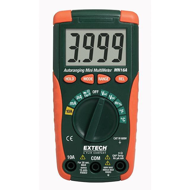 This is manufactured by FLIR Extech. The manufacturer part number is MN16A. Additionally, the product is designed with handheld Style. It is assigned with possible HTSUS value of 9030.31.0000. It comes in digital (dmm) configuration. It performs basic function of voltage, current, resistance, capacitance, temperature, frequency. The product is also supplied with battery, temperature probe. It is shipped in box. Its typical moisture sensitivity level is not applicable. It features a remarkable lcd display. The splendid features of the product include hold. The product is designated with the ear99 code number